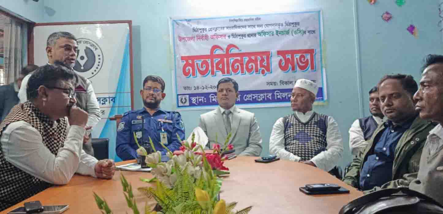 রবিবার (১৪ ডিসেম্বর) বিকেলে মিঠাপুকুর প্রেসক্লাব হলরুমে এই মতবিনিময় সভা অনুষ্ঠিত হয়। এতে সভাপতিত্ব করেন মিঠাপুকুর প্রেসক্লাবের সভাপতি, শেখসাদী সরকার। অনুষ্ঠান সঞ্চালনা করেন মিঠাপুকুর প্রেসক্লাবের সাধারণ সম্পাদক মেহেদী হাসান রিপুল।